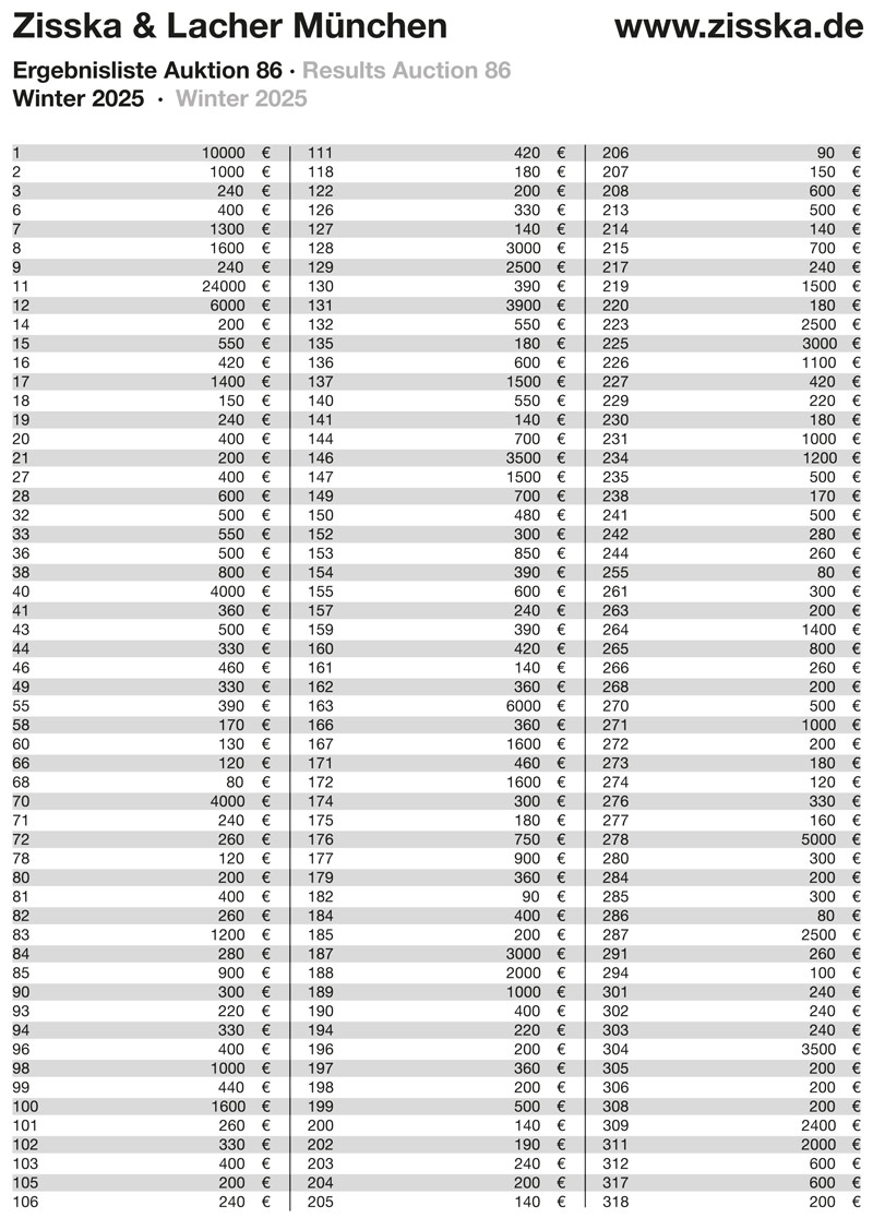 Komplette Ergebnisliste der Auktion 86 vom 26 – 28. November 2025.